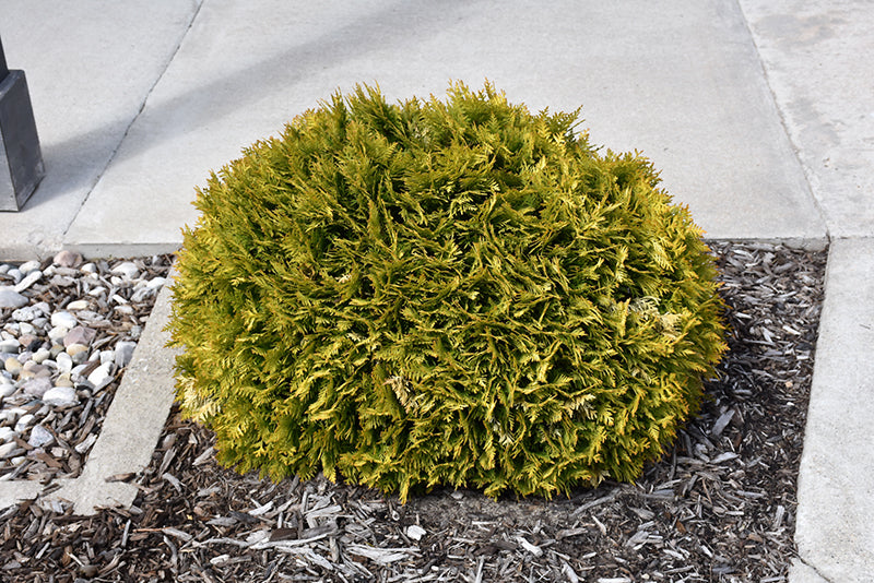 Versatile compact globe shaped evergreen displaying bright chartreuse foliage that persists through winter. Excellent burn resistance. A perfect choice for a container small space garden or plant en masse to add a color accent to the landscape.