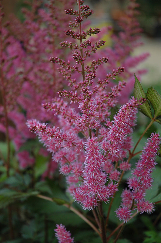 Highlighted against glossy dark green lacy foliage, the profusion of narrow pink-lavender plumes are dense and fuzzy. This tough variety blooms later, mid to late summer, and will tolerate drier conditions than most. Astilbe are mainstays of shade and woodland gardens
