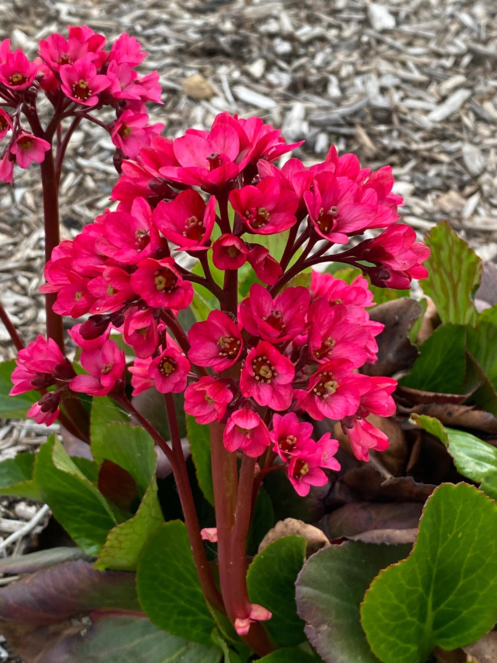 Solid rosettes of large, leathery, glossy green leaves send up an abundant display of bright rose-red flowers on sturdy red stems. The moss green leaves develop a beautiful burgundy halo around the edges that remain evergreen in milder climates. Blooms February to April and is a good performer even in difficult sites.