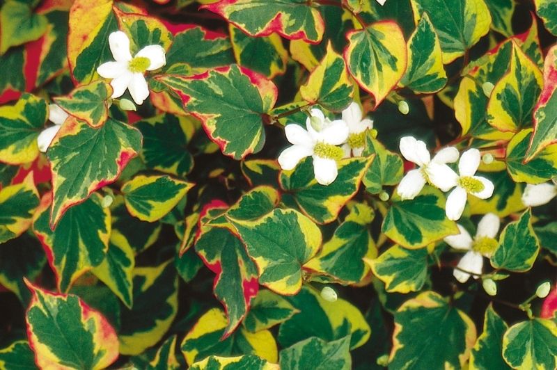 A terrific groundcover. Quick spreading perennial with erect stems holding heart-shaped multi-colored leaves of gray-green cream carmine and gold. Full sun gives best coloration. Herbaceous.