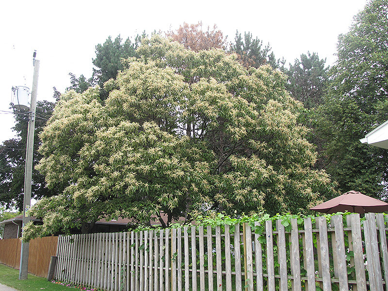 A possible replacement for the American chestnut which has been devastated by blight, this low-branched shrubby tree produces edible nuts in fall, excellent for roasting; immune to the chestnut blight; nuts can be messy in fall.