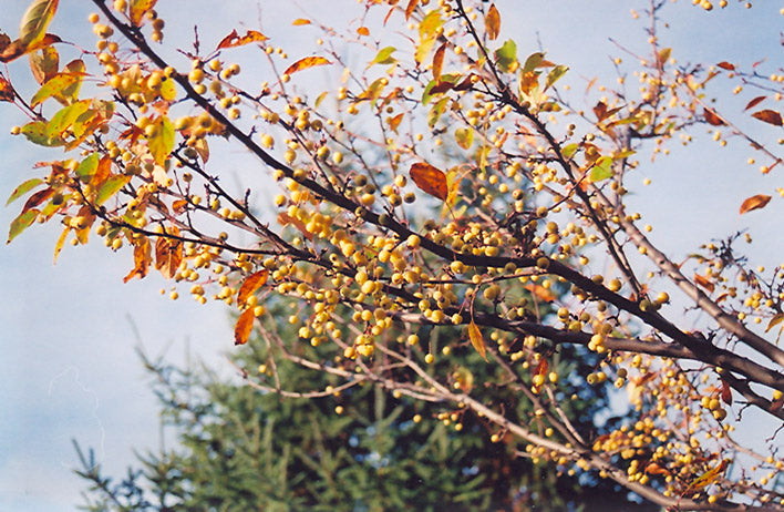 A wonderful ornamental tree with a profusion of white flowers in spring and showy and persistent golden fruit in fall, very upright habit of growth; makes a spectacular front yard accent, needs well-drained soil and full sun.