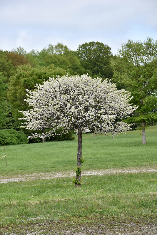 Here's an accent tree quite unlike anything you've ever seen before; a dense bushy globular head is grafted onto a standard, maintains its rounded form with minimal pruning; absolutely smothered in white flowers in spring, showy red fruit in fall.