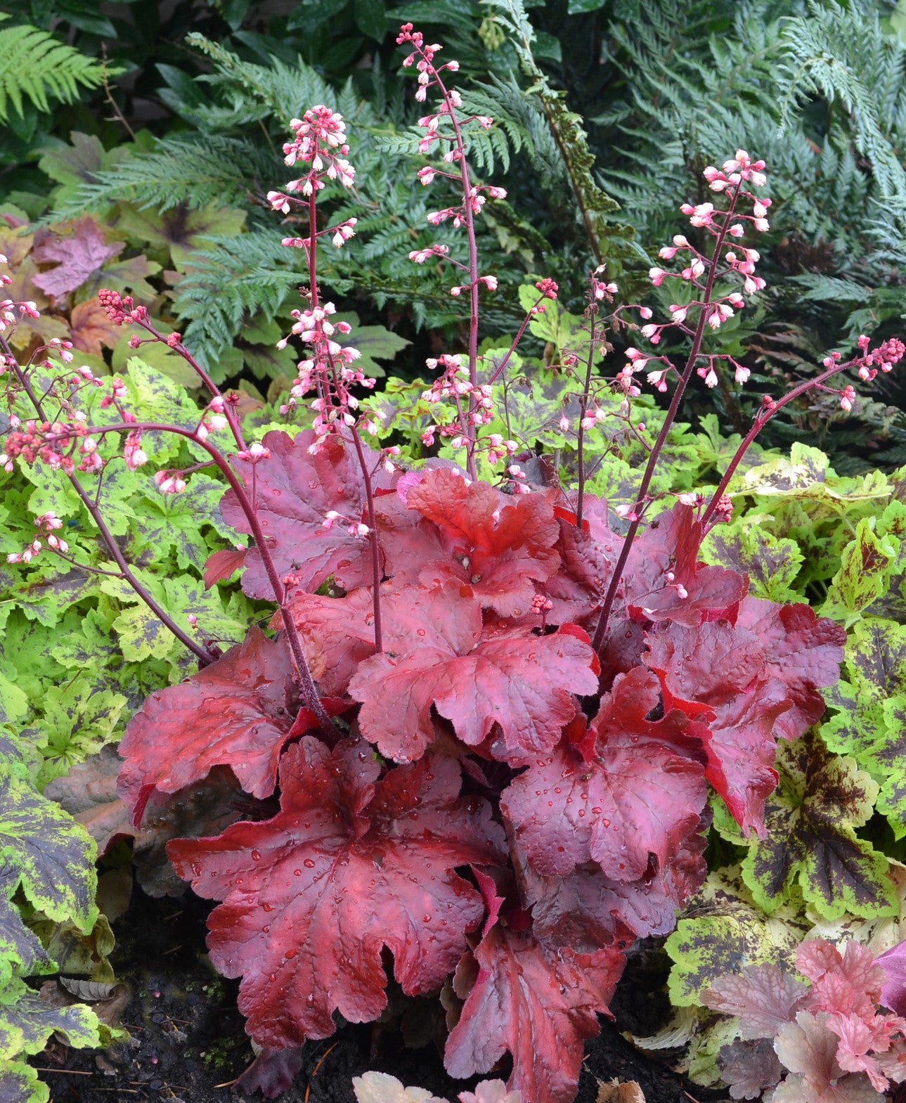 Bigger and brighter than 'Fire Chief' or 'Autumn Leaves' 'Fire Alarm' is bright red in spring and fall and darkens to a brown-red during the summer. This hybrid of H. villosa has thick leathery red red leaves that make delightful medium size mound. 'Fire Alarm' complements almost every section of the color palette but it can stand on its own without question.