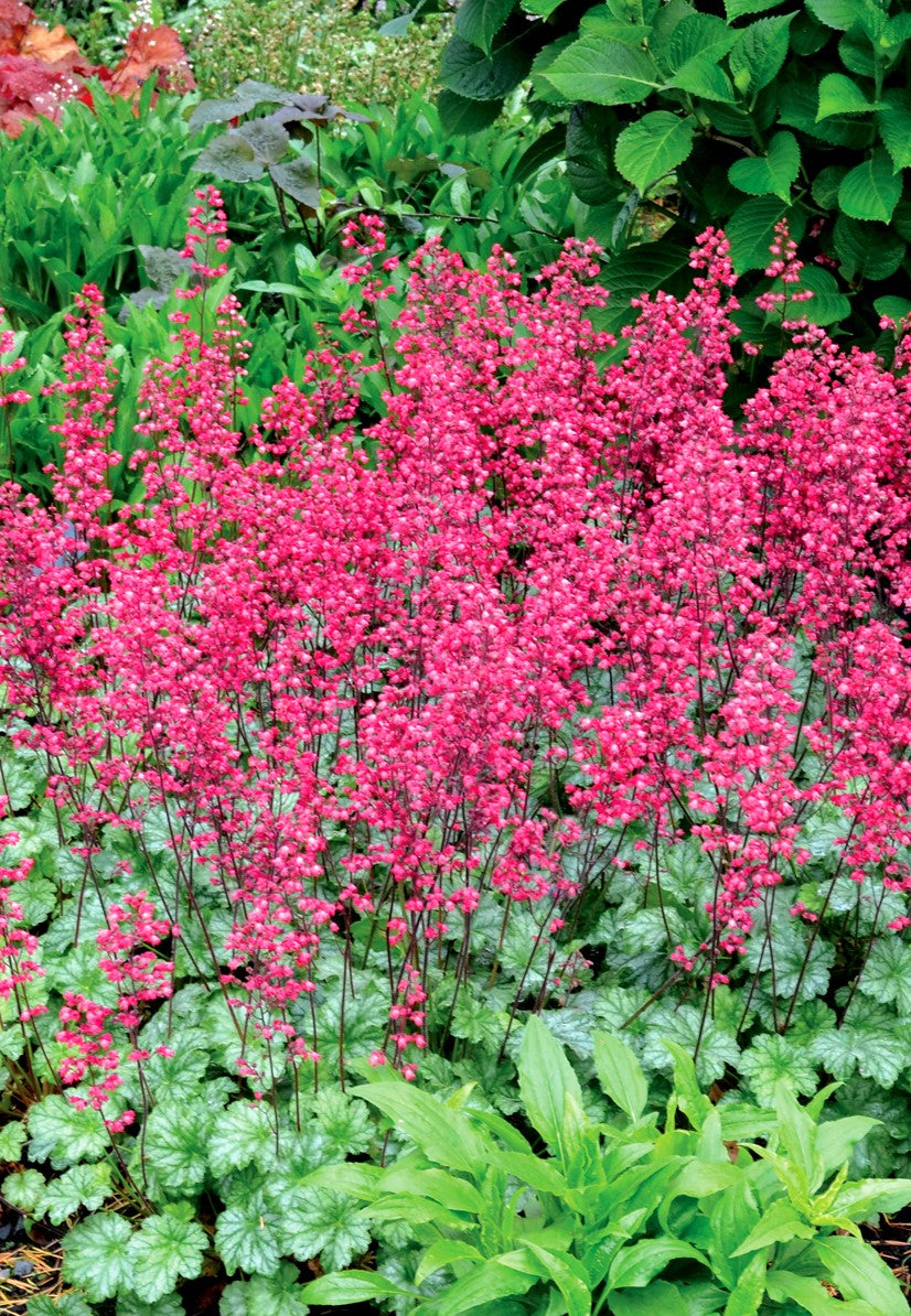This hybrid Coral Bells selection is a terrific choice for adding a touch of color towards the front of a border combining foliage interest with a bright display of blooms. The lobed leaves are mint-green overlaid with silver markings. Showy sprays of deep-pink flowers rise taller in late spring repeat blooming for most of the summer. Great in containers.