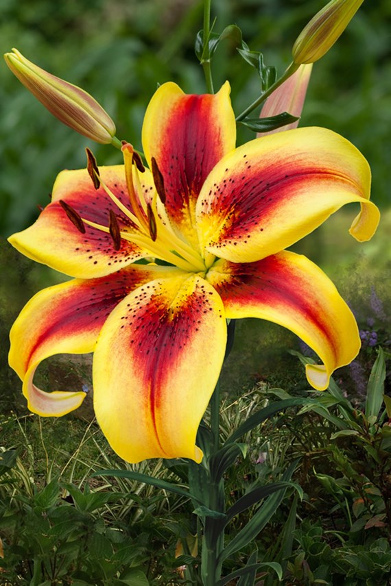 Huge 7" yellow flowers look tropical with red freckles and stripes; each petal is reflexed backward for an exotic look. Very fragrant. 3-5 buds per stem.