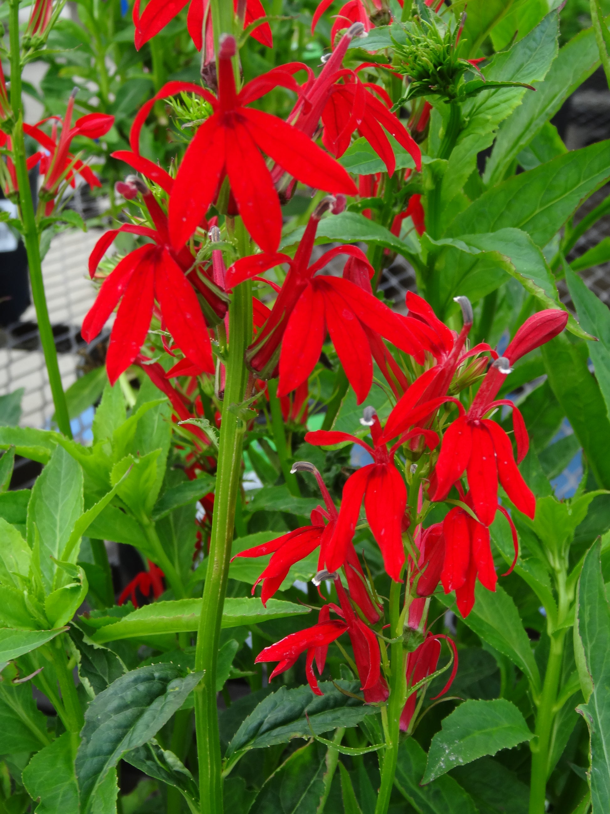 Brilliant red spires bloom in summer above very shiny foliage. Prolific self-seeder and fast grower. Nectar source for hummingbirds and butterflies.