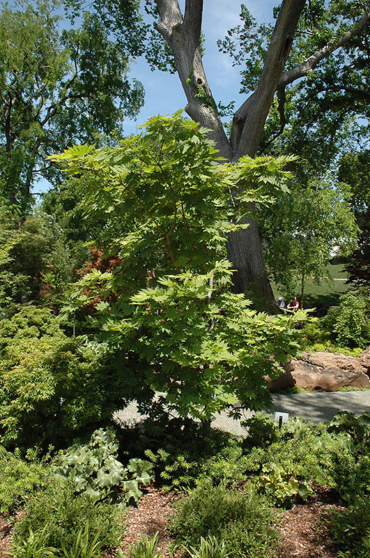 ‘Rising Sun’ is a recent Iseli selection with uncommonly large heavily textured leaves–up to 8″ across–that give the tree a tropical look. Its vigorous multi-branched habit produces sturdy limbs and rigid twigs and the autumn show of red yellow and orange will take your breath away.