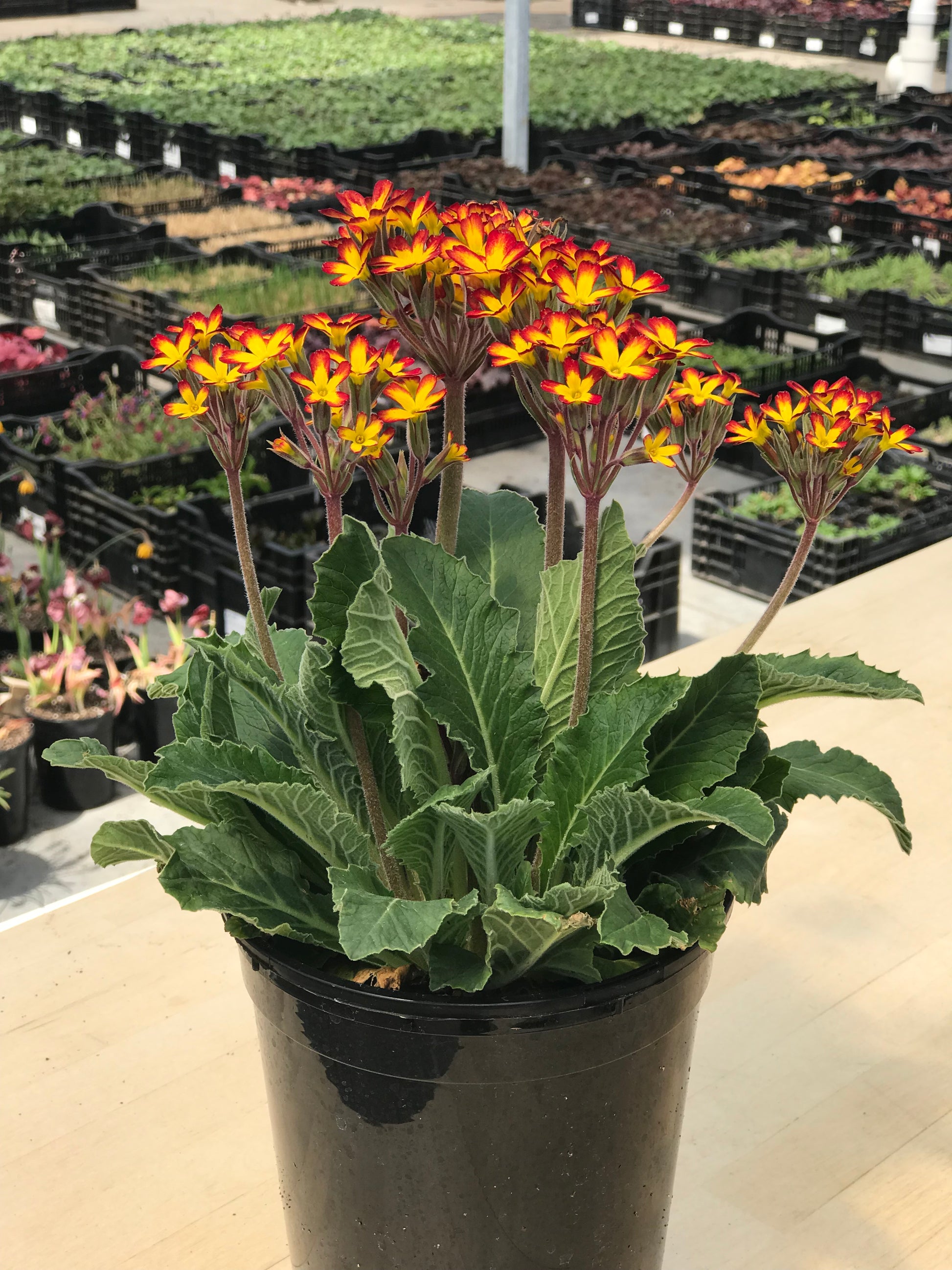 A primrose with unusual oak-leaf shaped foliage. Bright yellow flowers with orange-red edges appear in early spring. Very hardy; compact flowering.