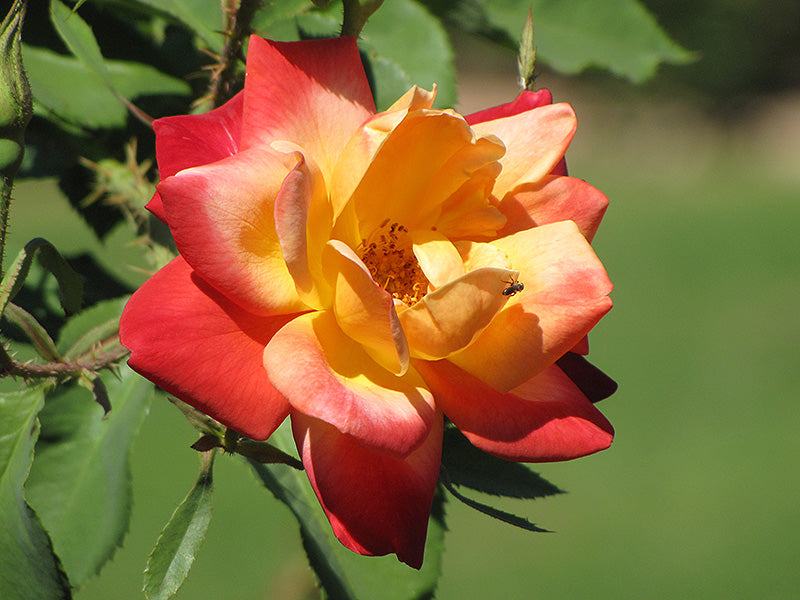 This vigorous rose is a hardy, reaching, large flowered climbing or shrub rose producing showy clusters of urn shaped to cupped double yellow flowers, suffused with orange, pink, red and coral as the flowers grow older; excellent for arbors and trellises.